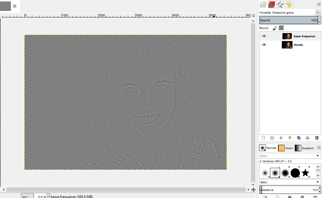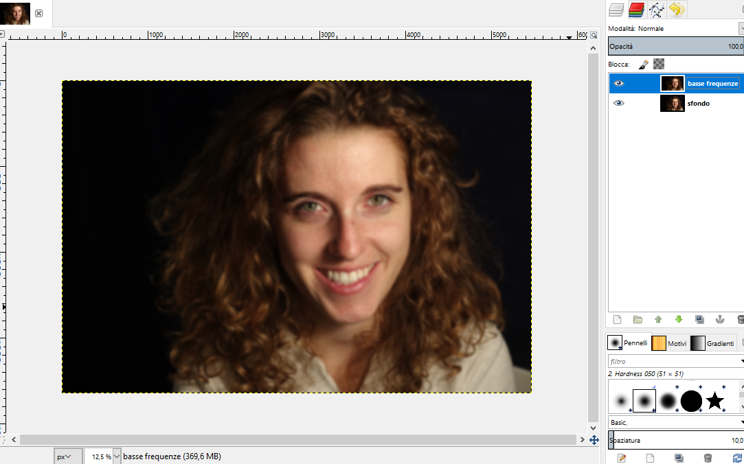 frequenze”. Ora applichiamo una sfocatura al livello delle basse frequenze: Filtri – sfocature – gaussiana.