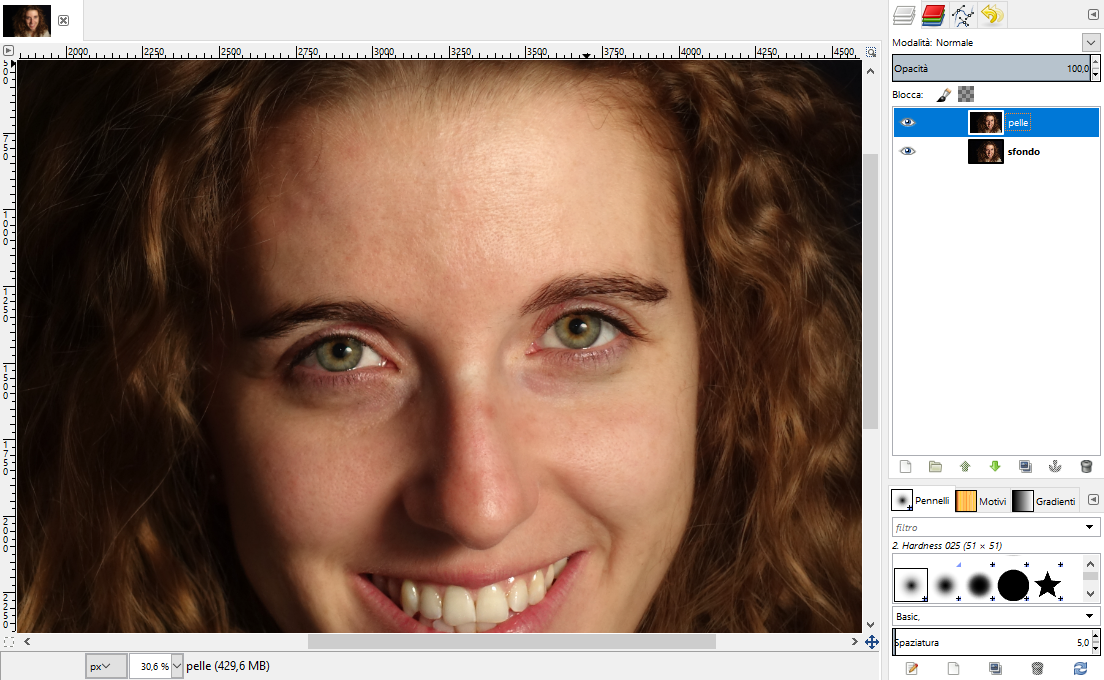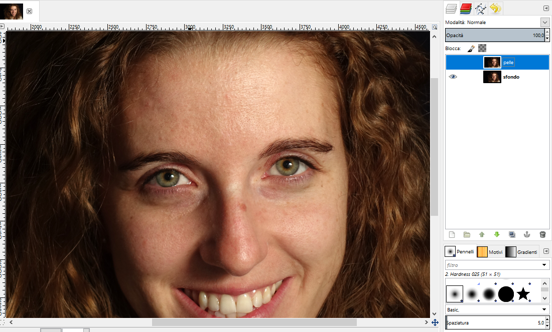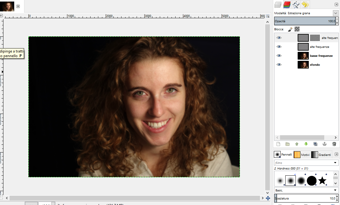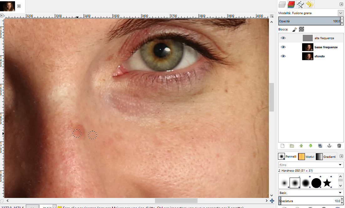 Torniamo sul livello delle alte frequenze. Adesso dobbiamo eliminare tutti i difetti della pelle (pori, brufoli,
