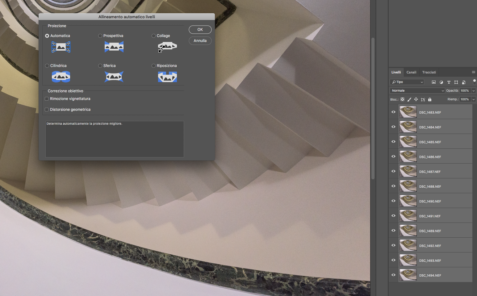 A questo punto, memori del fatto che i file non sono allineati, non faremo altro che selezionare tutti i livelli e allinearli grazie alle incredibili funzioni di Photoshop: menù Modifica-->Allineamento automatico livelli. Si apre una finestra sulla quale terremo l'impostazione automatica e daremo semplicemente l'OK. Pochi secondi e i livelli saranno allineati (provate per verifica a spegnere man mano gli "occhietti" ai livelli e ve ne renderete conto). Ovviamente per fare questo allineamento l'immagine finale andrà poi ritagliata per evitare che si vedano gli spostamenti dei fotogrammi. Nel caso qualche fotogramma non fosse riuscito ad allinearlo perchè avete avuto una botta di Parkinson durante gli scatti basterà eliminare quel singolo fotogramma.