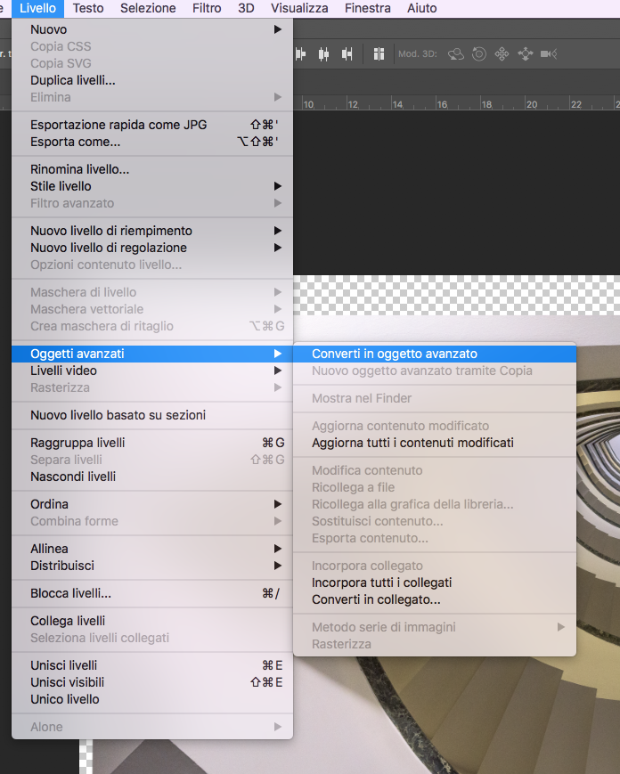 Fatto questo, sempre avendo tutti i livelli selezionati dovremo convertire il tutto in un oggetto avanzato, che, in parole povere, è una funzione che offre Ps di "tenere" dei dati in memoria ed alaborarli simultaneamente.