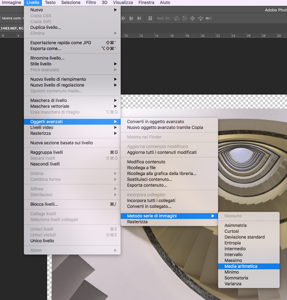 Ed ecco la funzione che cercavamo: Livello-->Oggetti avanzati-->Metodo serie di immagini-->Media aritmetica. Anche qui un filino di pazienza, i calcoli non sono complessi, ma sono tantissimi.